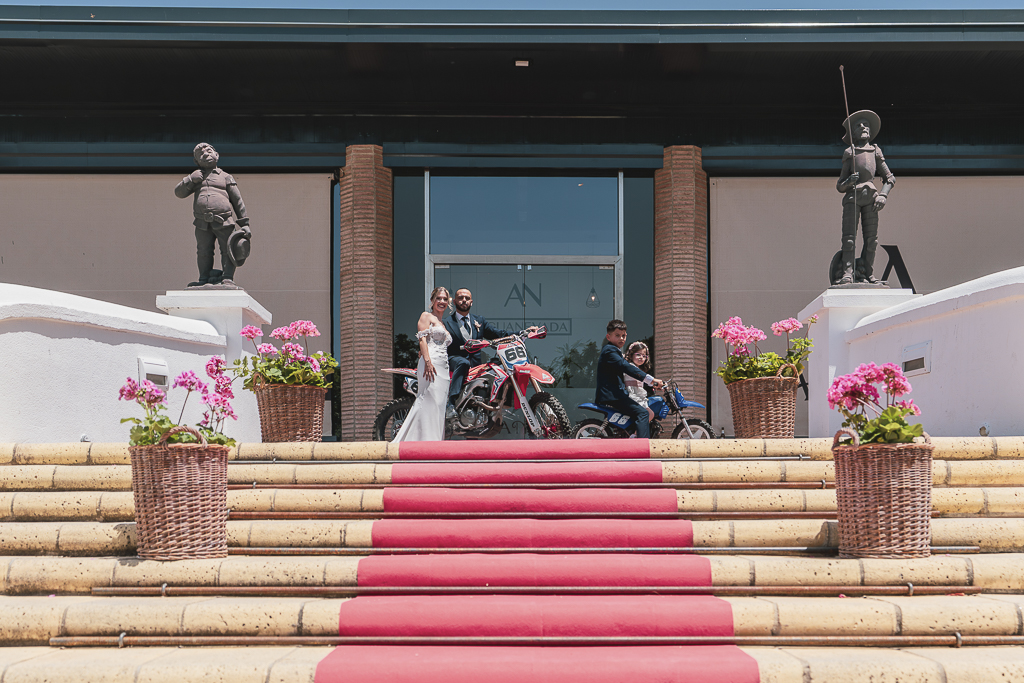 Una boda peculiar y genuina, la de Loly y Jairo que, tras darse el sí quiero aparecieron tanto ellos como sus peques en sus motos para llegar al banquete.